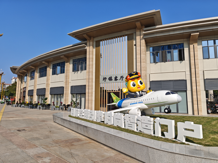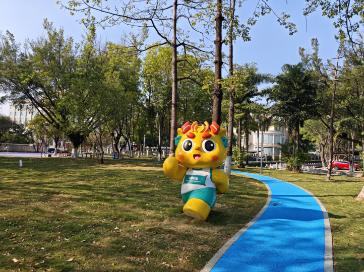 广场边还藏着一个特别的“圩镇客厅”。“花跃龙”是花山镇的城市IP形象。其设计融合木棉龙角、菊花石呆毛与镬耳屋等本土元素,象征花山从乡土到临空的跨越发展。性格活泼治愈,口头禅“起飞咯!”,寓意临空经济活力与人文温情,旨在串联城镇发展故事,打造可感知、可互动的情感符号。这里不仅是花山产业与经济的展示窗口,更承载着小镇的记忆与未来。走进去,你能触摸到花山的过去、现在和明天。
